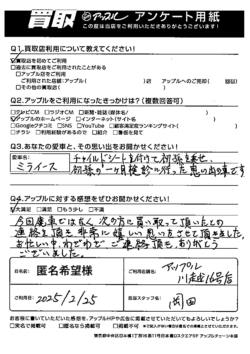 今回廃車ではなく、次の方に買い取って頂いたとの連絡を頂き非常に嬉しい思いをさせて頂きました。お忙しい中、わざわざご連絡を頂き、ありがとうございました。