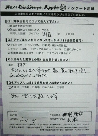 お車のご相談・ 査定だけでもOK! カンタン 入力 30秒 アップルがブランド買取始めました! お電話でも受付中! 受付時間9:30 ~ 18:30 052-735-6411 お車のご相談・ 査定だけでもOK! カンタン 入力 30秒 アップルがブランド買取始めました! お電話でも受付中! 受付時間9:30 ~ 18:30 052-735-6411 アップルがブランド買取始めました! お電話でも受付中! 受付時間9:30 ~ 18:30 052-735-6411 店舗情報 在庫車 スタッフ紹介 ブログ お客様の声 キャンペーン 無料査定 click お客様の声 ご記入日: 2015/11/01 K・K様 ■ご利用日時■ H27年11月1日■車種■ デミオ■担当者■ 山本【アップルに対する感想をぜひお書きください】満足度★★★★★また 宜しくお願いします。 前へ 次へ お客様の声一覧を見る