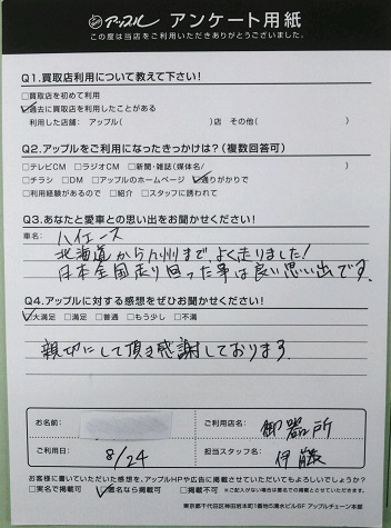 お車のご相談・ 査定だけでもOK! カンタン 入力 30秒 アップルがブランド買取始めました! お電話でも受付中! 受付時間9:30 ~ 18:30 052-735-6411 お車のご相談・ 査定だけでもOK! カンタン 入力 30秒 アップルがブランド買取始めました! お電話でも受付中! 受付時間9:30 ~ 18:30 052-735-6411 アップルがブランド買取始めました! お電話でも受付中! 受付時間9:30 ~ 18:30 052-735-6411 店舗情報 在庫車 スタッフ紹介 ブログ お客様の声 キャンペーン 無料査定 click お客様の声 ご記入日: 2016/08/24 M様 ■ご利用日時■ H28年08月24日■車種■ ハイエース■担当者■ 伊藤【アップルに対する感想をぜひお書きください】満足度★★★★★親切にしていただき感謝しております 前へ 次へ お客様の声一覧を見る