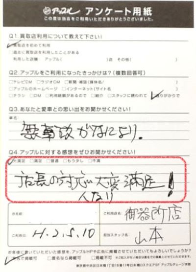 お車のご相談・ 査定だけでもOK! カンタン 入力 30秒 アップルがブランド買取始めました! お電話でも受付中! 受付時間9:30 ~ 18:30 052-735-6411 お車のご相談・ 査定だけでもOK! カンタン 入力 30秒 アップルがブランド買取始めました! お電話でも受付中! 受付時間9:30 ~ 18:30 052-735-6411 アップルがブランド買取始めました! お電話でも受付中! 受付時間9:30 ~ 18:30 052-735-6411 店舗情報 在庫車 スタッフ紹介 ブログ お客様の声 キャンペーン 無料査定 click お客様の声 ご記入日: 2020/05/10 T・S様 車名:日産 NV350キャラバン 満足度★★★★★店長の対応 大変満足!人なり 前へ 次へ お客様の声一覧を見る