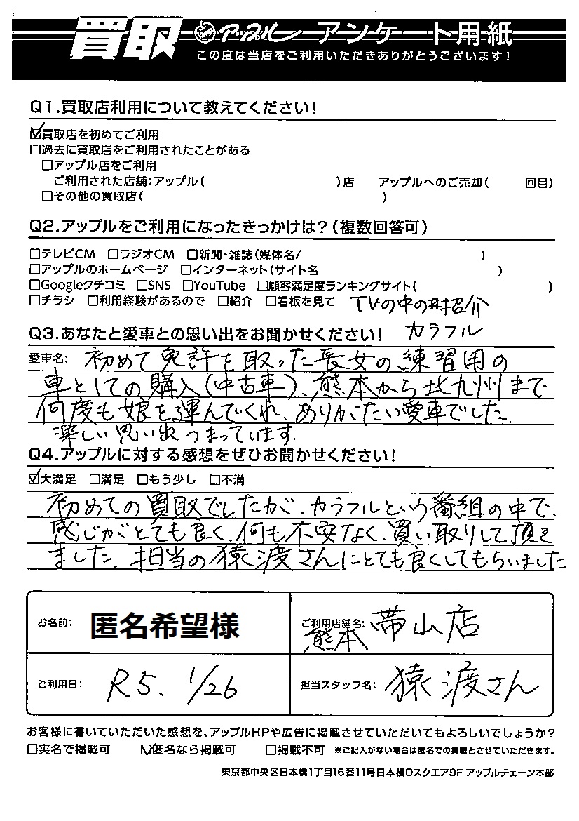 感じがとても良く、何も不安なく、買い取りして頂きました。