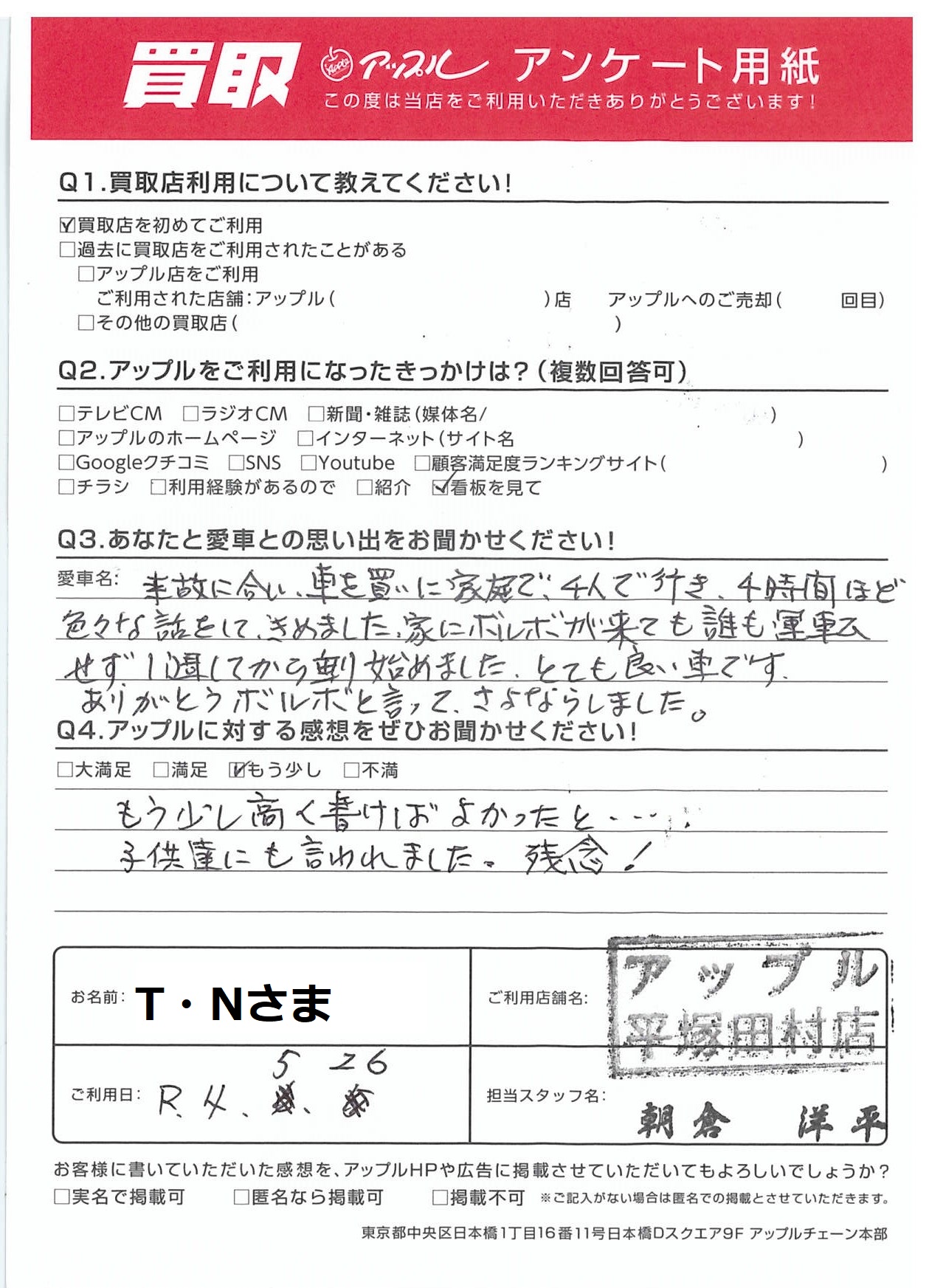 事故に会い、車を買いに家族で、4人で行き、4時間ほど色々な話をして、きめました。