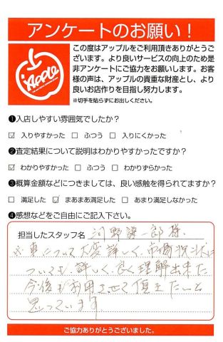 お車のご相談・ 査定だけでもOK! カンタン 入力 30秒 アップルがブランド買取始めました! お電話でも受付中! 受付時間10:00 ~ 19:00 0463-51-1122 お車のご相談・ 査定だけでもOK! カンタン 入力 30秒 アップルがブランド買取始めました! お電話でも受付中! 受付時間10:00 ~ 19:00 0463-51-1122 アップルがブランド買取始めました! お電話でも受付中! 受付時間10:00 ~ 19:00 0463-51-1122 店舗情報 在庫車 スタッフ紹介 ブログ お客様の声 キャンペーン お得 無料査定 click お客様の声 ご記入日: 2018/06/30 レボーグ様 車について大変詳しく市場状況についても詳しく良く理解出来た今後も利用させて頂きたいと思っています。 前へ 次へ お客様の声一覧を見る