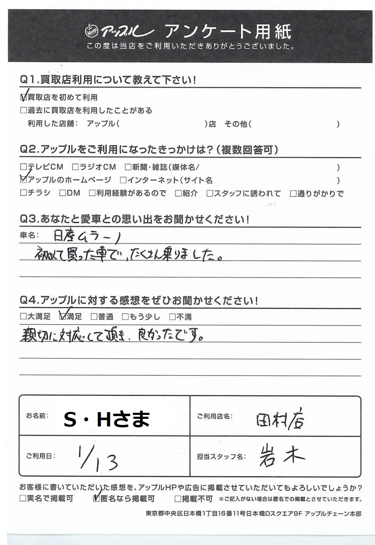 S・Hさま 担当させて頂きました店長の岩木です。