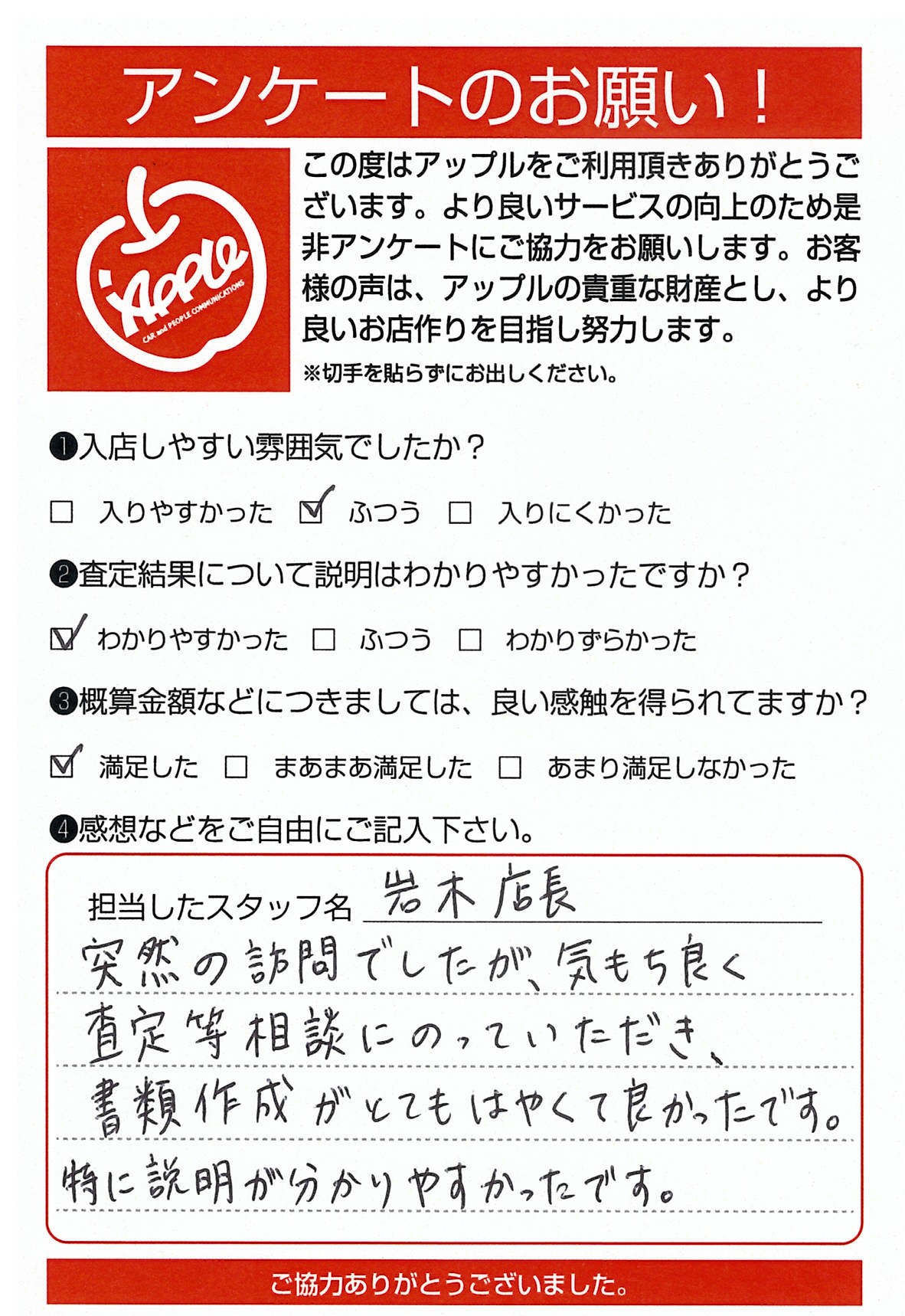 お車のご相談・ 査定だけでもOK! カンタン 入力 30秒 アップルがブランド買取始めました! お電話でも受付中! 受付時間10:00 ~ 19:00 0463-51-1122 お車のご相談・ 査定だけでもOK! カンタン 入力 30秒 アップルがブランド買取始めました! お電話でも受付中! 受付時間10:00 ~ 19:00 0463-51-1122 アップルがブランド買取始めました! お電話でも受付中! 受付時間10:00 ~ 19:00 0463-51-1122 店舗情報 在庫車 スタッフ紹介 ブログ お客様の声 キャンペーン お得 無料査定 click お客様の声 ご記入日: 2020/01/13 匿名希望様 突然の訪問でしたが、気持ち良く査定等相談にのっていただき書類作成がとてもはやくて良かったです。特に説明が分かりやすかったです。【スタッフより】担当させて頂きました店長の岩木です。アンケートいただきありがとうございます。お客様の中にご不明な部分が無くなる様に心掛けております。次回もご利用いただければ幸いです。 前へ 次へ お客様の声一覧を見る