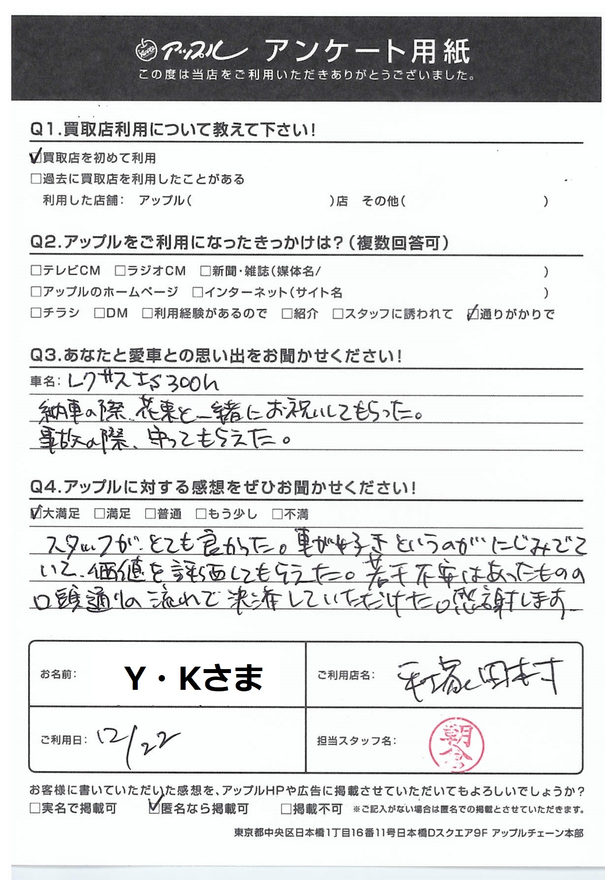 Y・Kさま 担当させて頂きました朝倉です。