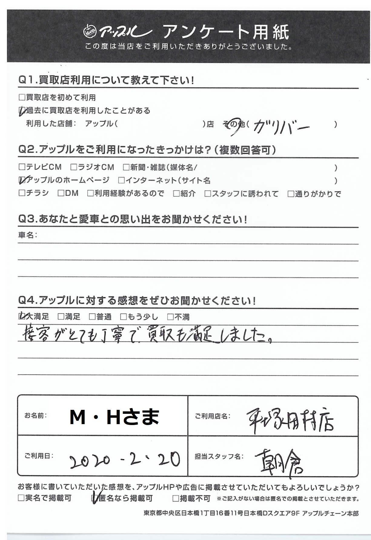 M・Hさま 担当させて頂きました朝倉です。