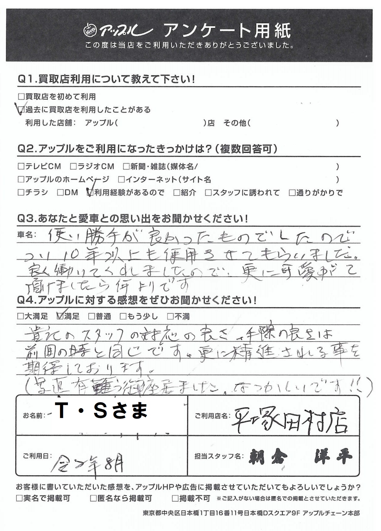 これからも精進してまいりますので、また機会が御座いましたらご利用ください。