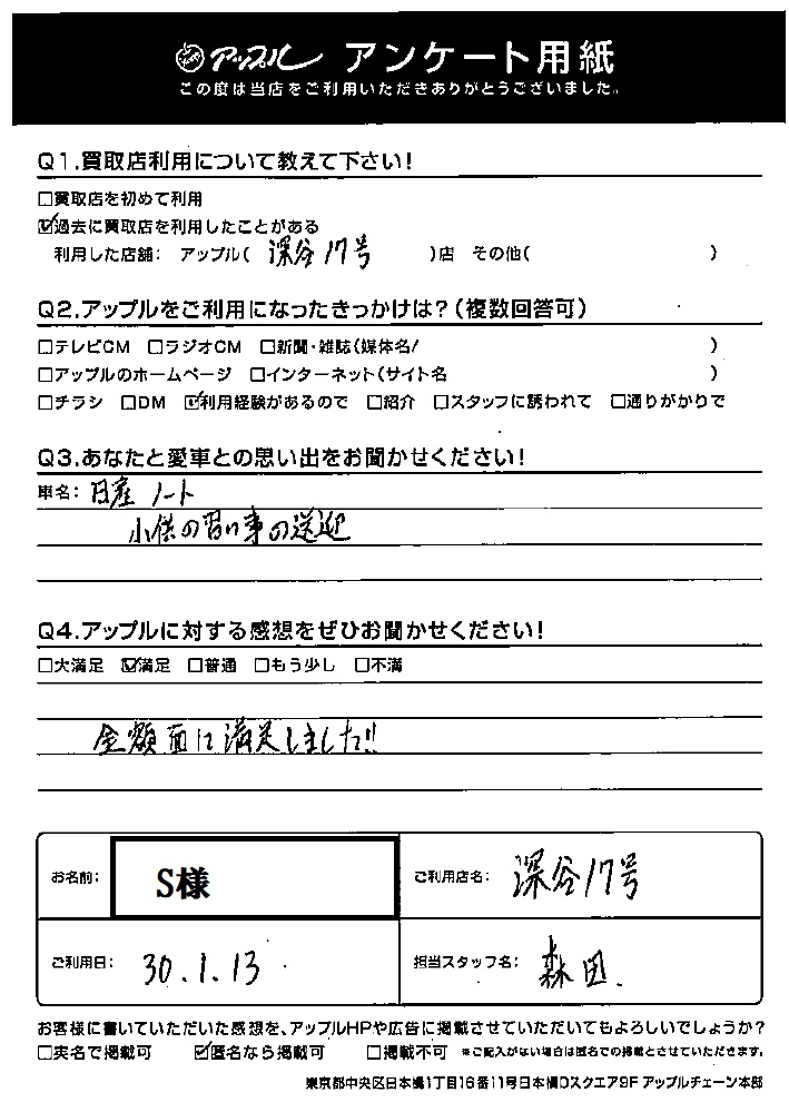 お車のご相談・ 査定だけでもOK! カンタン 入力 30秒 アップルがブランド買取始めました! お電話でも受付中! 受付時間AM10:00~PM7:00 048-573-1131 お車のご相談・ 査定だけでもOK! カンタン 入力 30秒 アップルがブランド買取始めました! お電話でも受付中! 受付時間AM10:00~PM7:00 048-573-1131 アップルがブランド買取始めました! お電話でも受付中! 受付時間AM10:00~PM7:00 048-573-1131 店舗情報 在庫車 スタッフ紹介 ブログ お客様の声 キャンペーン 無料査定 click お客様の声 ご記入日: 2018/01/13 S様 車名:日産 ノート Q:あなたと愛車との思い出をお聞かせください!車名:ノート子供の習い事の送迎Q:アップルに対する感想をぜひお聞かせください!満足金額面に満足しました!! 前へ 次へ お客様の声一覧を見る