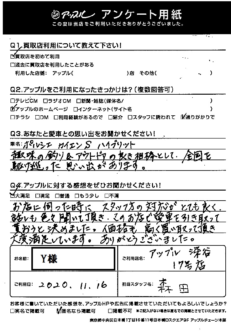 お店に伺った時にスタッフの方の対応がとても良く、話も色々と聞いて頂き、このお店で愛車を引き取って貰おうと決めました。価格も高く買い取って頂き大変満足しています。ありがとうございました。