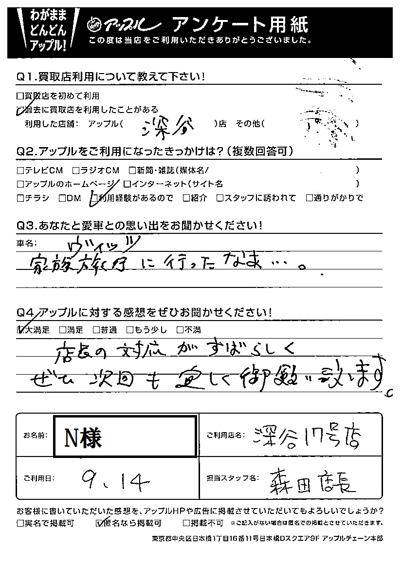 店長の対応がすばらしく せひ次回も宜しく御願い致します。