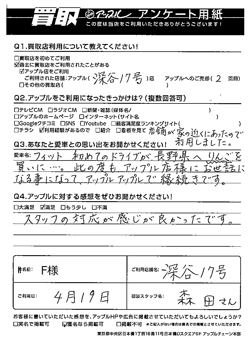 F様 車名:ホンダ フィット(H25年9月以降のハイブリッド含む)