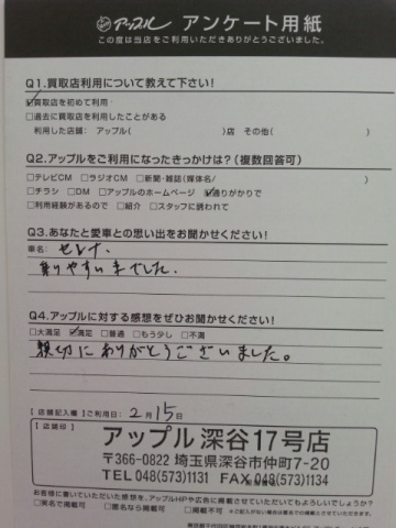 お車のご相談・ 査定だけでもOK! カンタン 入力 30秒 アップルがブランド買取始めました! お電話でも受付中! 受付時間AM10:00~PM7:00 048-573-1131 お車のご相談・ 査定だけでもOK! カンタン 入力 30秒 アップルがブランド買取始めました! お電話でも受付中! 受付時間AM10:00~PM7:00 048-573-1131 アップルがブランド買取始めました! お電話でも受付中! 受付時間AM10:00~PM7:00 048-573-1131 店舗情報 在庫車 スタッフ紹介 ブログ お客様の声 キャンペーン 無料査定 click お客様の声 ご記入日: 2016/02/15 匿名希望様 {愛車との思い出}乗りやすい車でした。{アップルに対する感想}親切にありがとうございました。 前へ 次へ お客様の声一覧を見る