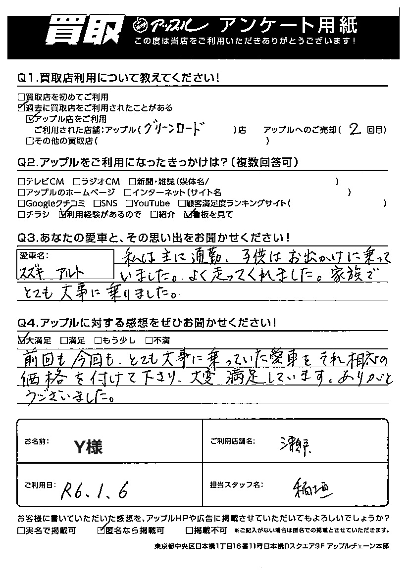 Y様 車名:スズキ アルト (2015年12月以降のワークス含む)