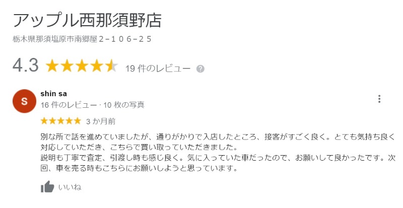 お客様から「アップル西那須野店に愛車を売ってよかった・・・・」