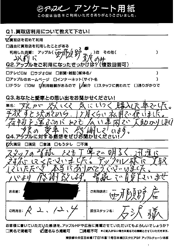 娘が欲しくて気にいって購入した車でした。手放すと決めてから、1ヶ月くらい私用で使いました。荷物を運ぶのにとても広い車内で大助かりしました。娘の愛車に感謝しています。