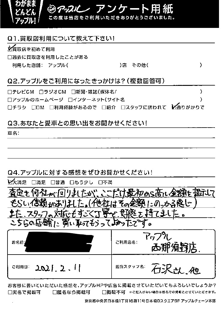 査定を何社か回りましたが、ここだけ最初から高い金額を提示してもらい、信頼がありました。(他社はその金額にのっかる感じ)また、スタッフの対応もすごく丁寧で、好感を持てました。こちらの店舗に買い取ってもらってよかったです。