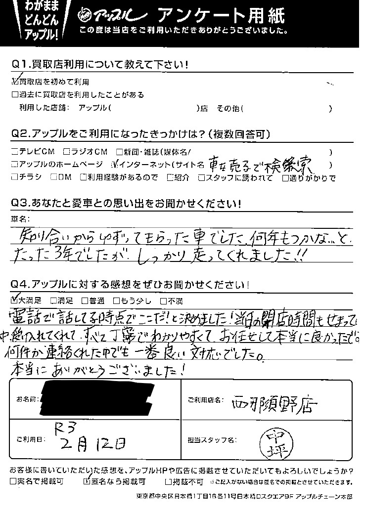 知り合いからゆずってもらった車でした。何年もつかな…と、たった3年でしたが、しっかり走ってくれました!!