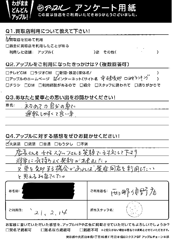 店長さんも女性スタッフさんも笑顔で対応して下さり非常に気持ちよく契約が出来ました。又車を売却する機会があれば、是非同店を利用したいと思えるお店でした。