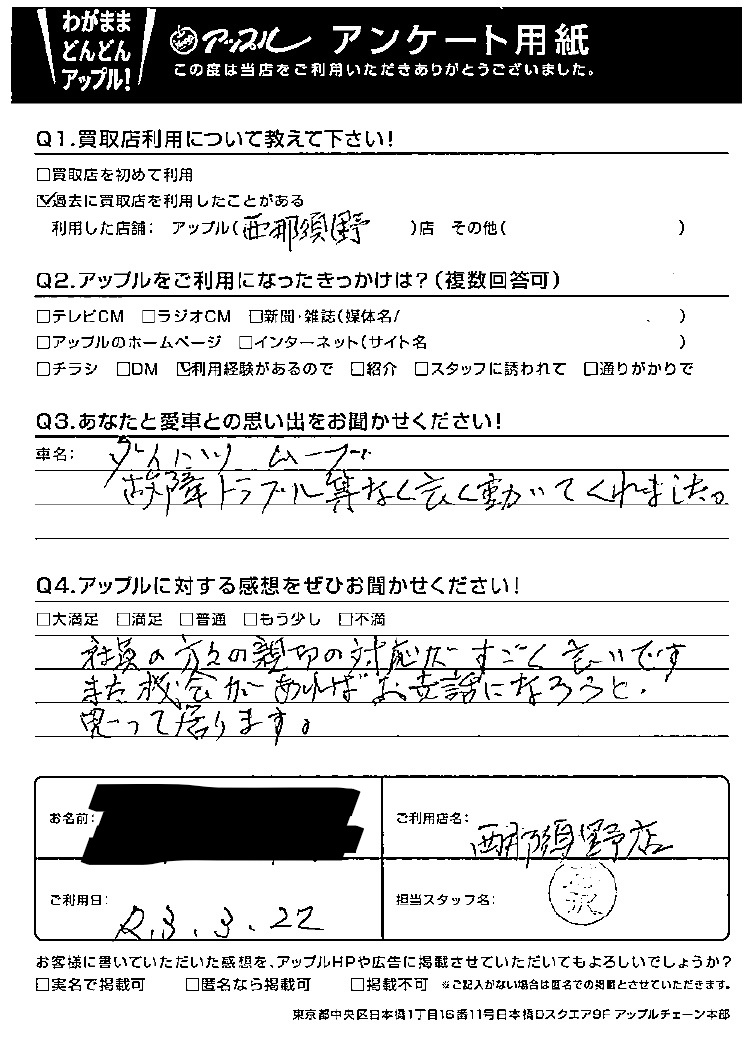お車のご相談・ 査定だけでもOK! カンタン 入力 30秒 アップルがブランド買取始めました! お電話でも受付中! 受付時間10:00 ~ 19:00 0287-38-0544 お車のご相談・ 査定だけでもOK! カンタン 入力 30秒 アップルがブランド買取始めました! お電話でも受付中! 受付時間10:00 ~ 19:00 0287-38-0544 アップルがブランド買取始めました! お電話でも受付中! 受付時間10:00 ~ 19:00 0287-38-0544 店舗情報 在庫車 スタッフ紹介 ブログ お客様の声 キャンペーン 無料査定 click お客様の声 ご記入日: 2021/03/22 O様 車名:ダイハツ ムーヴ 「愛車との思い出」故障トラブル等なく良く動いてくれました。「アップルに対する感想」社員の方々の親切の対応がすごく良いです。また機会があればお世話になろうと思って居ります。 前へ 次へ お客様の声一覧を見る