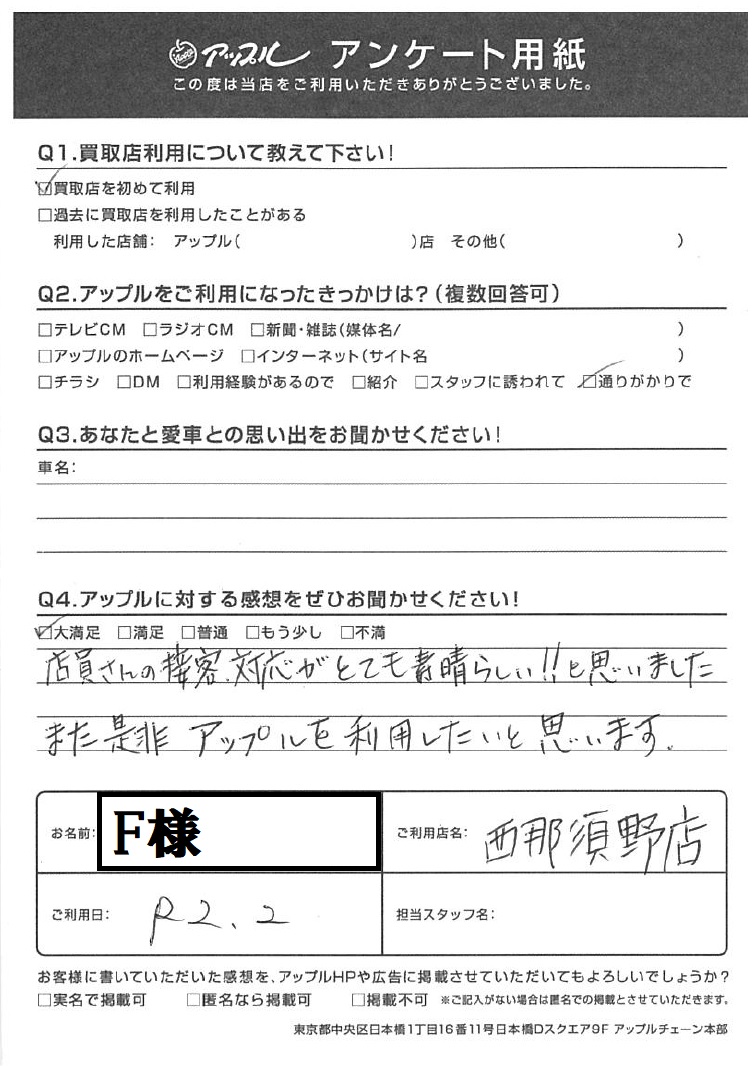 お車のご相談・ 査定だけでもOK! カンタン 入力 30秒 アップルがブランド買取始めました! お電話でも受付中! 受付時間10:00 ~ 19:00 0287-38-0544 お車のご相談・ 査定だけでもOK! カンタン 入力 30秒 アップルがブランド買取始めました! お電話でも受付中! 受付時間10:00 ~ 19:00 0287-38-0544 アップルがブランド買取始めました! お電話でも受付中! 受付時間10:00 ~ 19:00 0287-38-0544 店舗情報 在庫車 スタッフ紹介 ブログ お客様の声 キャンペーン 無料査定 click お客様の声 ご記入日: 2020/02/10 F様 Q:アップルに対する感想をぜひお聞かせください!大満足店員さんの接客対応がとても素晴らしい!!と思いました。また是非アップルを利用したいと思います。 前へ 次へ お客様の声一覧を見る