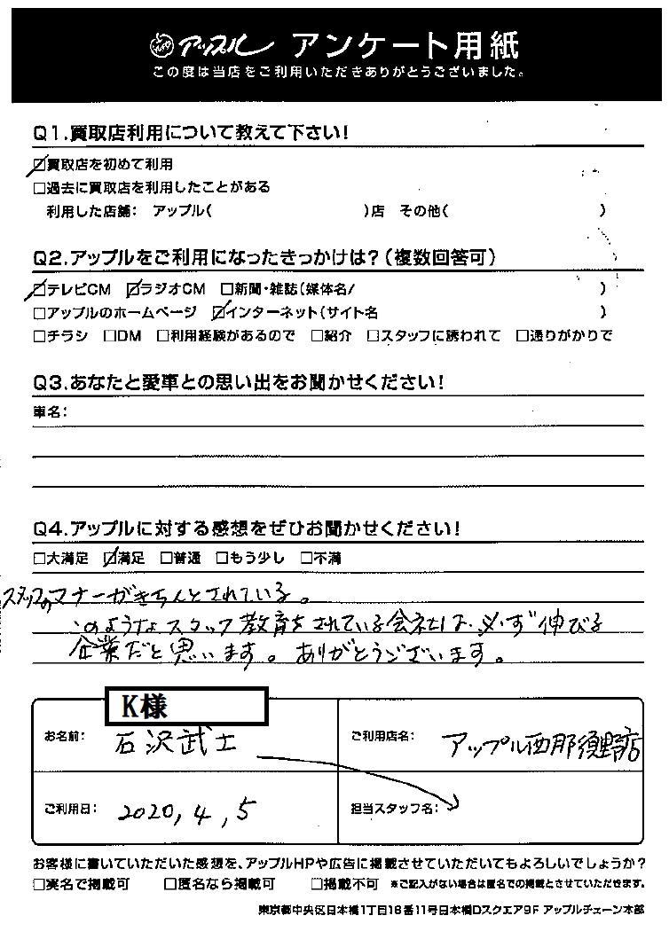 お車のご相談・ 査定だけでもOK! カンタン 入力 30秒 アップルがブランド買取始めました! お電話でも受付中! 受付時間10:00 ~ 19:00 0287-38-0544 お車のご相談・ 査定だけでもOK! カンタン 入力 30秒 アップルがブランド買取始めました! お電話でも受付中! 受付時間10:00 ~ 19:00 0287-38-0544 アップルがブランド買取始めました! お電話でも受付中! 受付時間10:00 ~ 19:00 0287-38-0544 店舗情報 在庫車 スタッフ紹介 ブログ お客様の声 キャンペーン 無料査定 click お客様の声 ご記入日: 2020/04/05 K様 Q:アップルに対する感想をぜひお聞かせください!満足スタッフのマナーがきちんとされている。このようなスタッフ教育をされている会社は必ず伸びる企業だと思います。ありがとうございます。 前へ 次へ お客様の声一覧を見る
