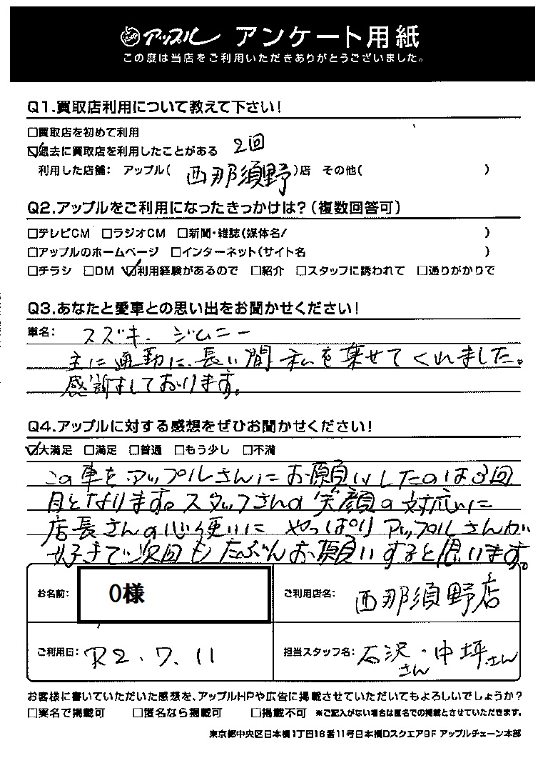 O様 車名:スズキ ジムニー