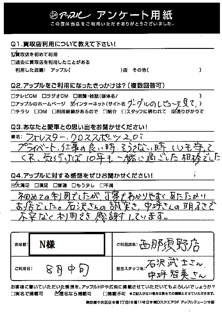 初めての利用でしたが、丁寧でわかりやすく、あたたかいお店でした。石沢さんの誠実さ、中坪さんの明るさで不安なく利用でき感謝しています。