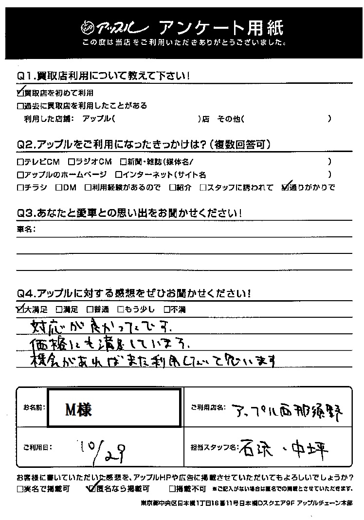 お車のご相談・ 査定だけでもOK! カンタン 入力 30秒 アップルがブランド買取始めました! お電話でも受付中! 受付時間10:00 ~ 19:00 0287-38-0544 お車のご相談・ 査定だけでもOK! カンタン 入力 30秒 アップルがブランド買取始めました! お電話でも受付中! 受付時間10:00 ~ 19:00 0287-38-0544 アップルがブランド買取始めました! お電話でも受付中! 受付時間10:00 ~ 19:00 0287-38-0544 店舗情報 在庫車 スタッフ紹介 ブログ お客様の声 キャンペーン 無料査定 click お客様の声 ご記入日: 2020/10/29 M様 Q:アップルに対する感想をぜひお聞かせください!対応が良かったです。価格にも満足しています。機会があればまた利用したいと思います。 前へ 次へ お客様の声一覧を見る