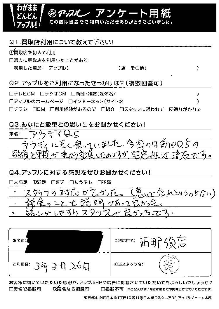 アウディに長く乗っていました。今回のは前のQ5の破損と車検が重なり交換したのですが、安定性は流石です。