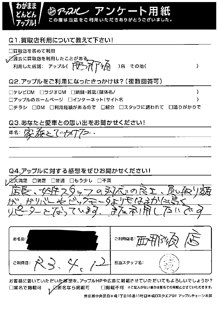 店長、女性スタッフの対応の良さ、買い取り額が、ガリバーやビックモーターよりもはるかに高くリピーターとなっています。また利用したいです。