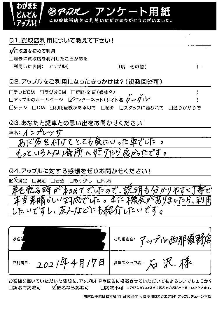 車を売る時が初めてでしたので、説明も分かりやすく丁寧で本当素晴らしい対応でした。また機会がありましたら、利用したいですし、友人などにも紹介したいです。