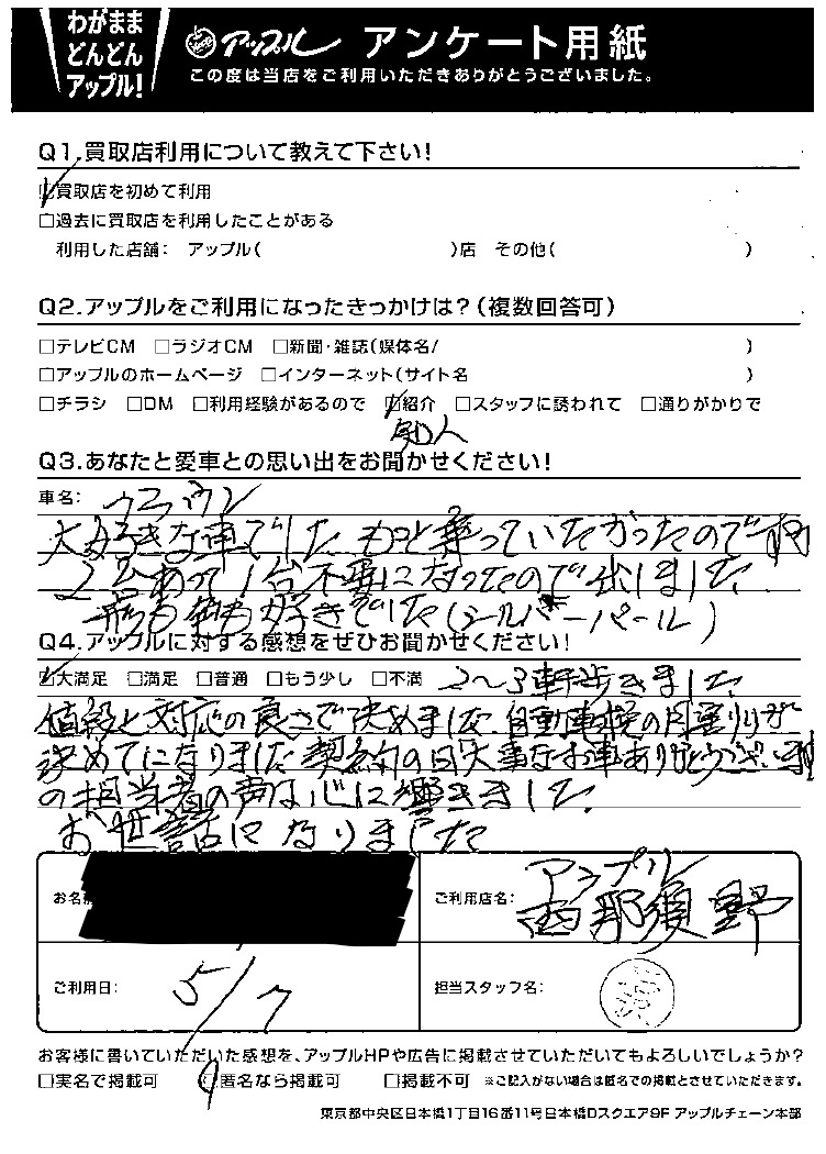 2~3軒歩きました。値段と対応の良さで決めました。自動車税の月割りが決めてになりました。契約の日「大事なお車ありがとうございます」の担当者の声は心に響きました。お世話になりました。