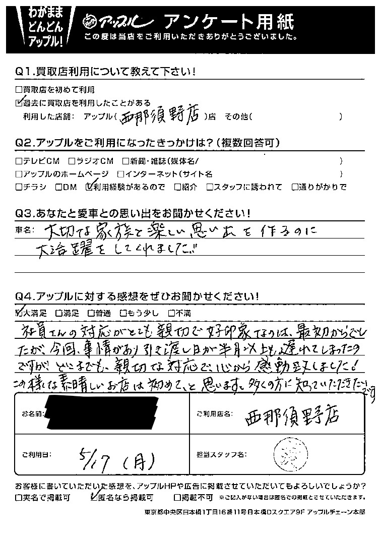 社員さんの対応がとても親切で好印象なのは最初からでしたが、今回事情があり引き渡し日が半月以上も遅れてしまったのですが、どこまでも、親切な対応で、心から感動致しました!この様な素晴らしいお店は初めてと思います。多くの方に知っていただきたいです。