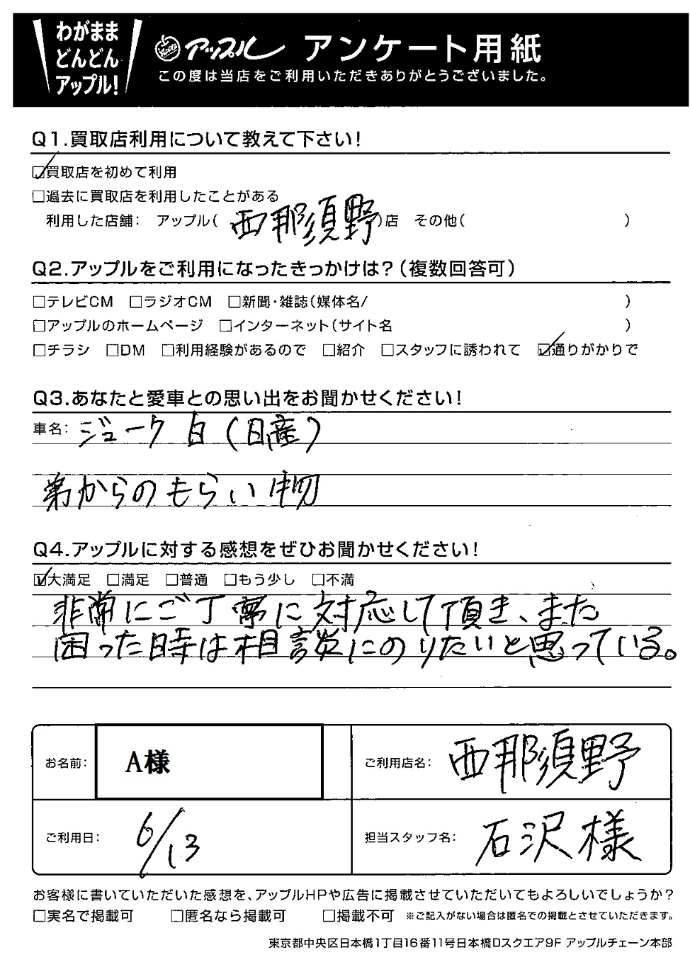 お車のご相談・ 査定だけでもOK! カンタン 入力 30秒 アップルがブランド買取始めました! お電話でも受付中! 受付時間10:00 ~ 19:00 0287-38-0544 お車のご相談・ 査定だけでもOK! カンタン 入力 30秒 アップルがブランド買取始めました! お電話でも受付中! 受付時間10:00 ~ 19:00 0287-38-0544 アップルがブランド買取始めました! お電話でも受付中! 受付時間10:00 ~ 19:00 0287-38-0544 店舗情報 在庫車 スタッフ紹介 ブログ お客様の声 キャンペーン 無料査定 click お客様の声 ご記入日: 2021/06/13 A様 車名:日産 ジューク 「愛車との思い出」ジューク白(日産)弟からのもらい物「アップルに対する感想」非常にご丁寧に対応して頂き、また困った時は相談にのりたいと思っている。 前へ 次へ お客様の声一覧を見る