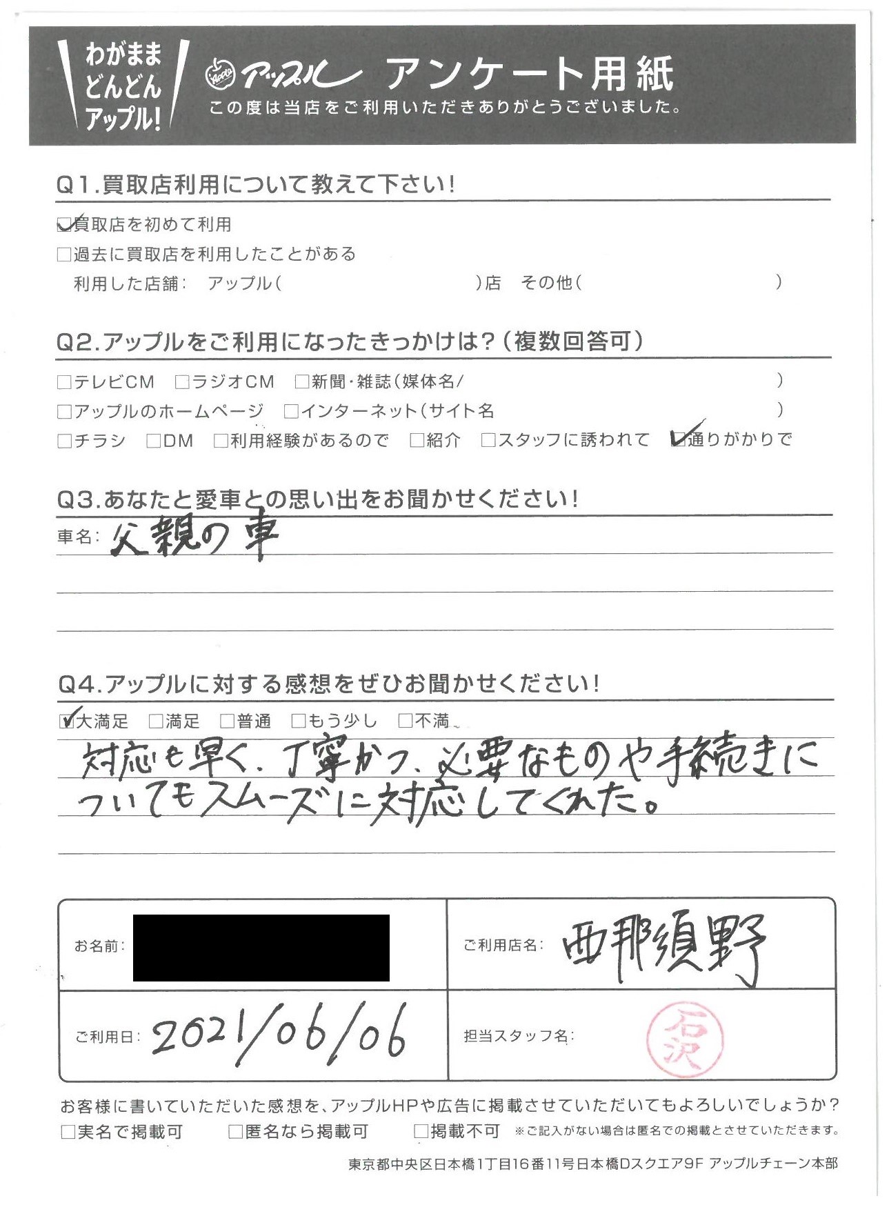 お車のご相談・ 査定だけでもOK! カンタン 入力 30秒 アップルがブランド買取始めました! お電話でも受付中! 受付時間10:00 ~ 19:00 0287-38-0544 お車のご相談・ 査定だけでもOK! カンタン 入力 30秒 アップルがブランド買取始めました! お電話でも受付中! 受付時間10:00 ~ 19:00 0287-38-0544 アップルがブランド買取始めました! お電話でも受付中! 受付時間10:00 ~ 19:00 0287-38-0544 店舗情報 在庫車 スタッフ紹介 ブログ お客様の声 キャンペーン 無料査定 click お客様の声 ご記入日: 2021/06/06 A様 車名:トヨタ RAV4(R04年10月~RAV4 PHV含む) 【愛車との思い出】父親の車【アップルに対する感想】大満足対応も早く、丁寧かつ、必要なものや手続きについてもスムーズに対応してくれた。 前へ 次へ お客様の声一覧を見る