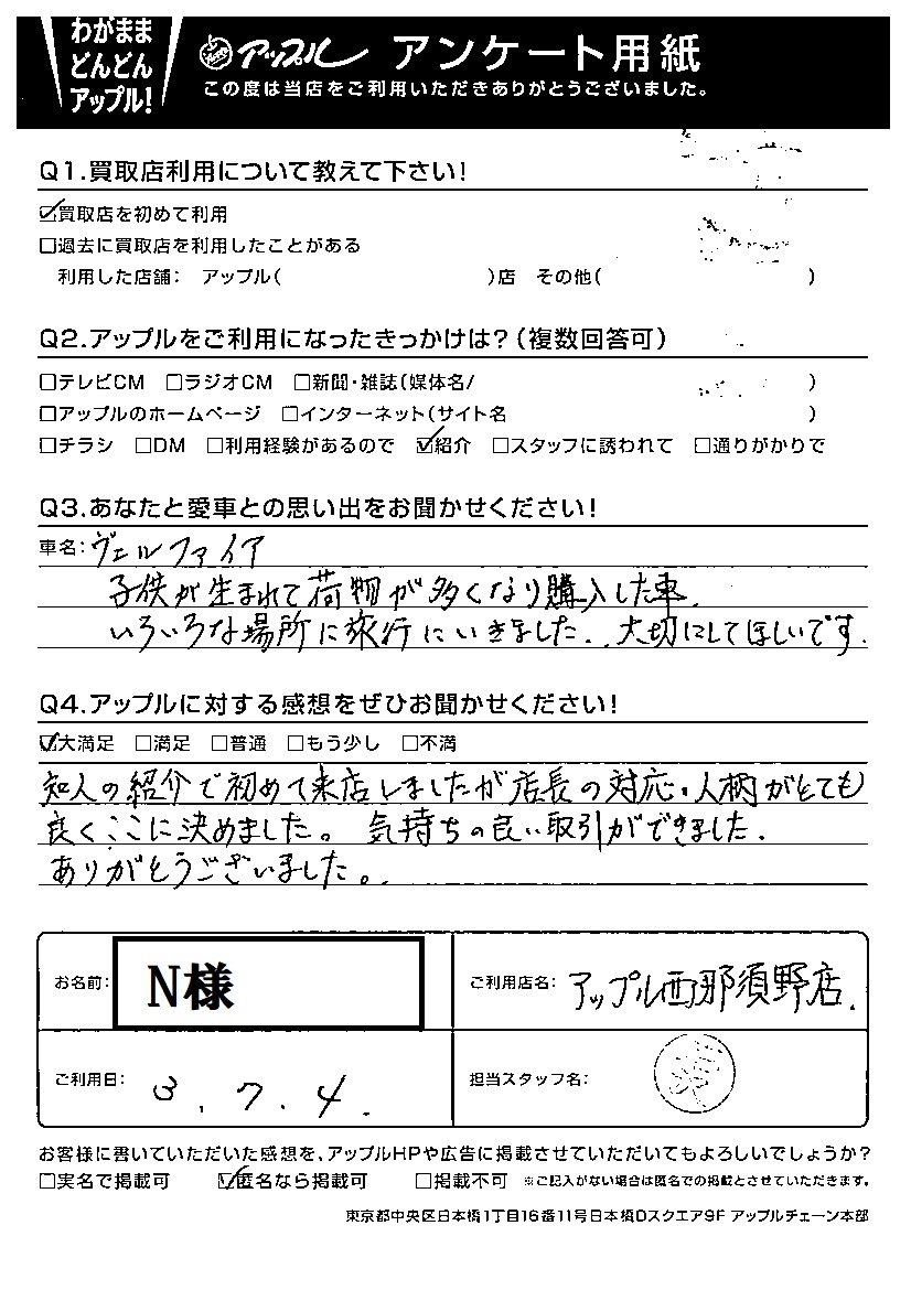 知人の紹介で初めて来店しましたが店長の対応・人柄がとても良くここに決めました。気持ちの良い取引ができました。ありがとうございました。