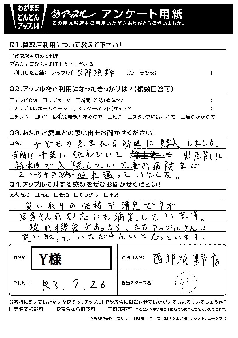 買い取りの価格も満足ですが、店員さんの対応にも満足しています。次の機会があったら、またアップルさんに買い取っていただきたいと思っています。