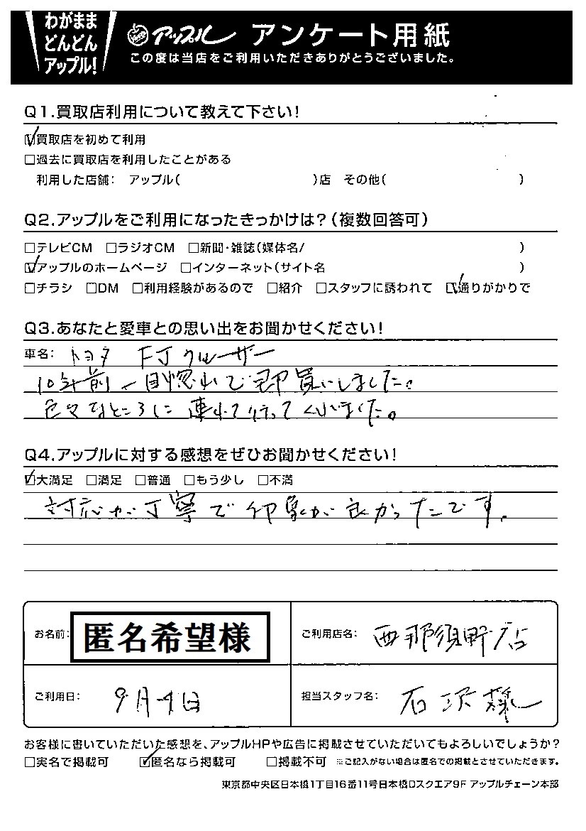 お車のご相談・ 査定だけでもOK! カンタン 入力 30秒 アップルがブランド買取始めました! お電話でも受付中! 受付時間10:00 ~ 19:00 0287-38-0544 お車のご相談・ 査定だけでもOK! カンタン 入力 30秒 アップルがブランド買取始めました! お電話でも受付中! 受付時間10:00 ~ 19:00 0287-38-0544 アップルがブランド買取始めました! お電話でも受付中! 受付時間10:00 ~ 19:00 0287-38-0544 店舗情報 在庫車 スタッフ紹介 ブログ お客様の声 キャンペーン 無料査定 click お客様の声 ご記入日: 2021/09/04 匿名希望様 車名:トヨタ FJクルーザー(国内モデル 右H) 【愛車との思い出】10年前一目惚れで即買いしました。色々なところに連れて行ってくれました。『アップルに対する感想』大満足対応が丁寧で印象が良かったです。 前へ 次へ お客様の声一覧を見る
