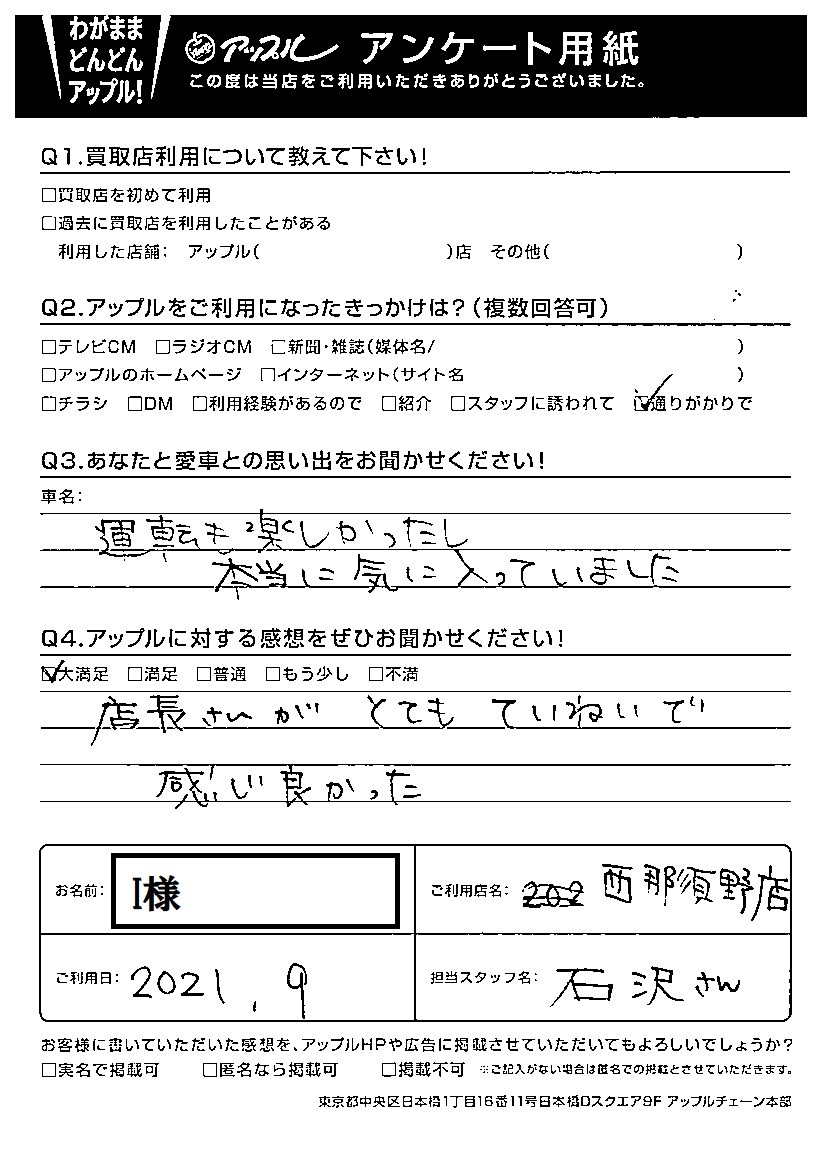 お車のご相談・ 査定だけでもOK! カンタン 入力 30秒 アップルがブランド買取始めました! お電話でも受付中! 受付時間10:00 ~ 19:00 0287-38-0544 お車のご相談・ 査定だけでもOK! カンタン 入力 30秒 アップルがブランド買取始めました! お電話でも受付中! 受付時間10:00 ~ 19:00 0287-38-0544 アップルがブランド買取始めました! お電話でも受付中! 受付時間10:00 ~ 19:00 0287-38-0544 店舗情報 在庫車 スタッフ紹介 ブログ お客様の声 キャンペーン 無料査定 click お客様の声 ご記入日: 2021/09/18 I様 車名:ルノー カングー 【愛車との思い出】運転も楽しかったし本当に気に入っていました。『アップルに対する感想』大満足店長さんがとてもていねいで感じ良かった。 前へ 次へ お客様の声一覧を見る