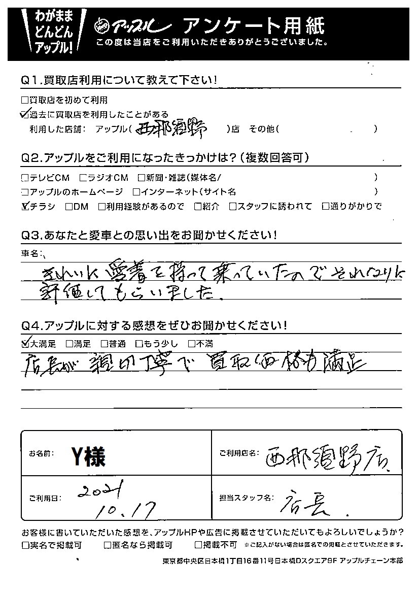 お車のご相談・ 査定だけでもOK! カンタン 入力 30秒 アップルがブランド買取始めました! お電話でも受付中! 受付時間10:00 ~ 19:00 0287-38-0544 お車のご相談・ 査定だけでもOK! カンタン 入力 30秒 アップルがブランド買取始めました! お電話でも受付中! 受付時間10:00 ~ 19:00 0287-38-0544 アップルがブランド買取始めました! お電話でも受付中! 受付時間10:00 ~ 19:00 0287-38-0544 店舗情報 在庫車 スタッフ紹介 ブログ お客様の声 キャンペーン 無料査定 click お客様の声 ご記入日: 2021/10/17 Y様 車名:スズキ MRワゴン 【愛車との思い出】きれいに愛着を持って乗っていたのでそれなりに評価してもらいました。『アップルに対する感想』大満足店長が親切丁寧で買取価格も満足 前へ 次へ お客様の声一覧を見る
