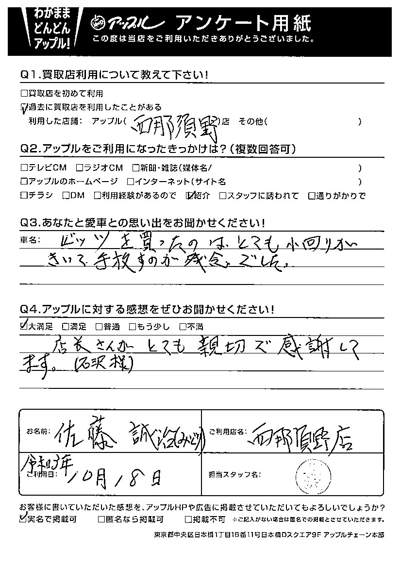 お車のご相談・ 査定だけでもOK! カンタン 入力 30秒 アップルがブランド買取始めました! お電話でも受付中! 受付時間10:00 ~ 19:00 0287-38-0544 お車のご相談・ 査定だけでもOK! カンタン 入力 30秒 アップルがブランド買取始めました! お電話でも受付中! 受付時間10:00 ~ 19:00 0287-38-0544 アップルがブランド買取始めました! お電話でも受付中! 受付時間10:00 ~ 19:00 0287-38-0544 店舗情報 在庫車 スタッフ紹介 ブログ お客様の声 キャンペーン 無料査定 click お客様の声 ご記入日: 2021/10/18 佐藤 誠治 みどり様 車名:トヨタ ヴィッツ 【愛車との思い出】ヴィッツを買ったのは、とても小回りがきいて、手放すのが残念でした。『アップルに対する感想』大満足店長さんがとても親切で感謝してます。(石沢様) 前へ 次へ お客様の声一覧を見る