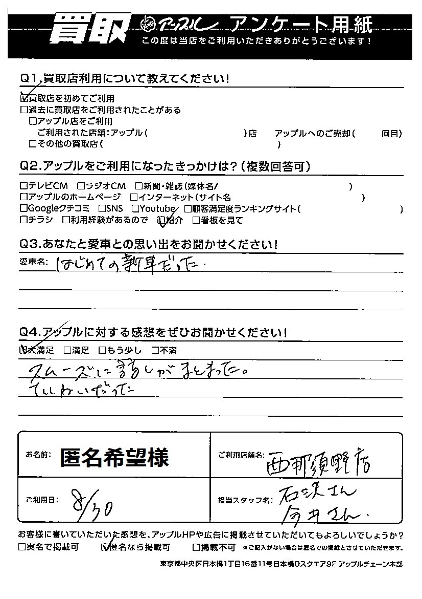 お車のご相談・ 査定だけでもOK! カンタン 入力 30秒 アップルがブランド買取始めました! お電話でも受付中! 受付時間10:00 ~ 19:00 0287-38-0544 お車のご相談・ 査定だけでもOK! カンタン 入力 30秒 アップルがブランド買取始めました! お電話でも受付中! 受付時間10:00 ~ 19:00 0287-38-0544 アップルがブランド買取始めました! お電話でも受付中! 受付時間10:00 ~ 19:00 0287-38-0544 店舗情報 在庫車 スタッフ紹介 ブログ お客様の声 キャンペーン 無料査定 click お客様の声 ご記入日: 2022/08/30 匿名希望様 Q あなたと愛車との思い出をお聞かせください!はじめての新車だった。Q アップルに対する感想をぜひお聞かせください!感想:大満足スムーズに話しがまとまった。ていねいだった。 前へ 次へ お客様の声一覧を見る