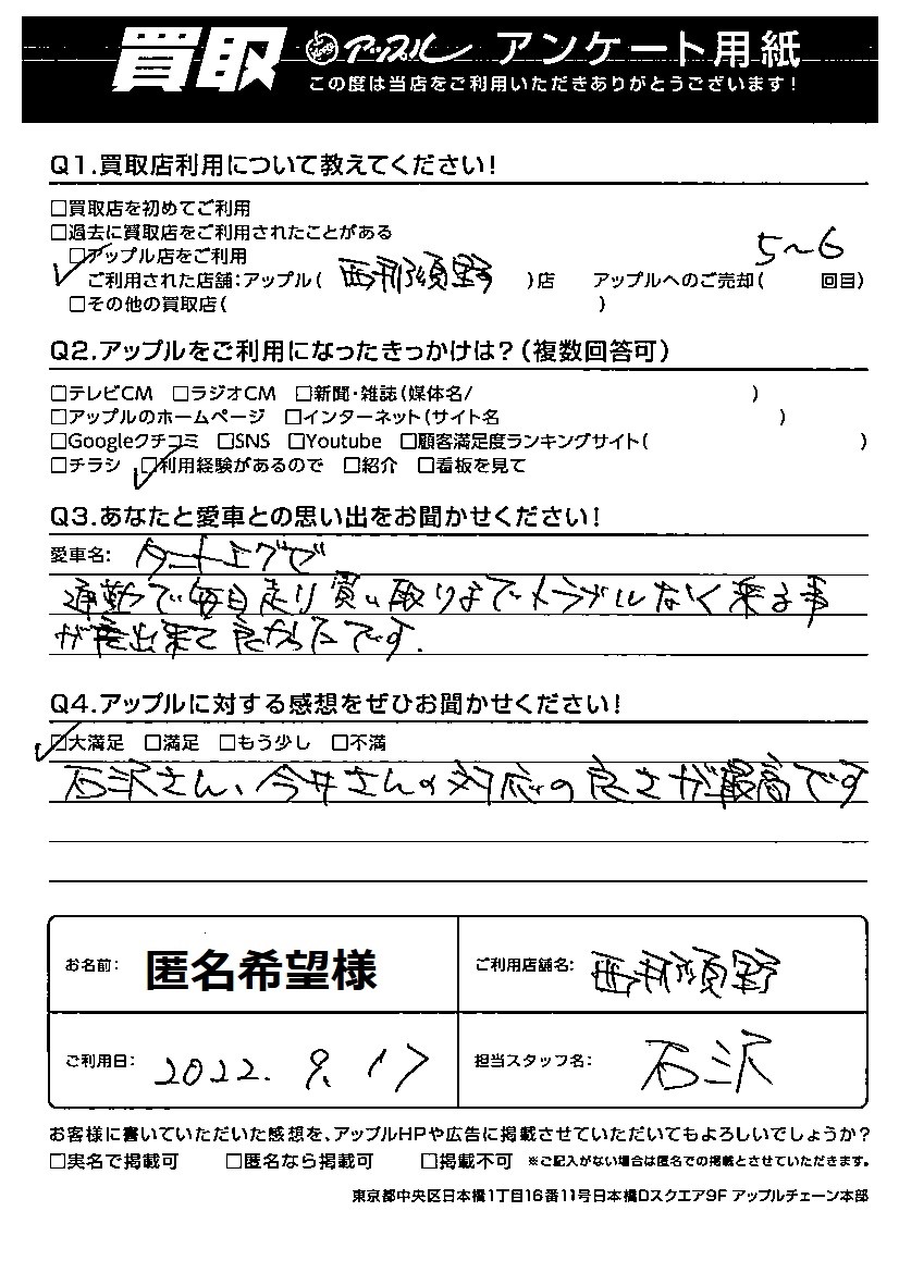通勤で毎日走り買い取りまでトラブルなく乗る事が出来て良かったです。