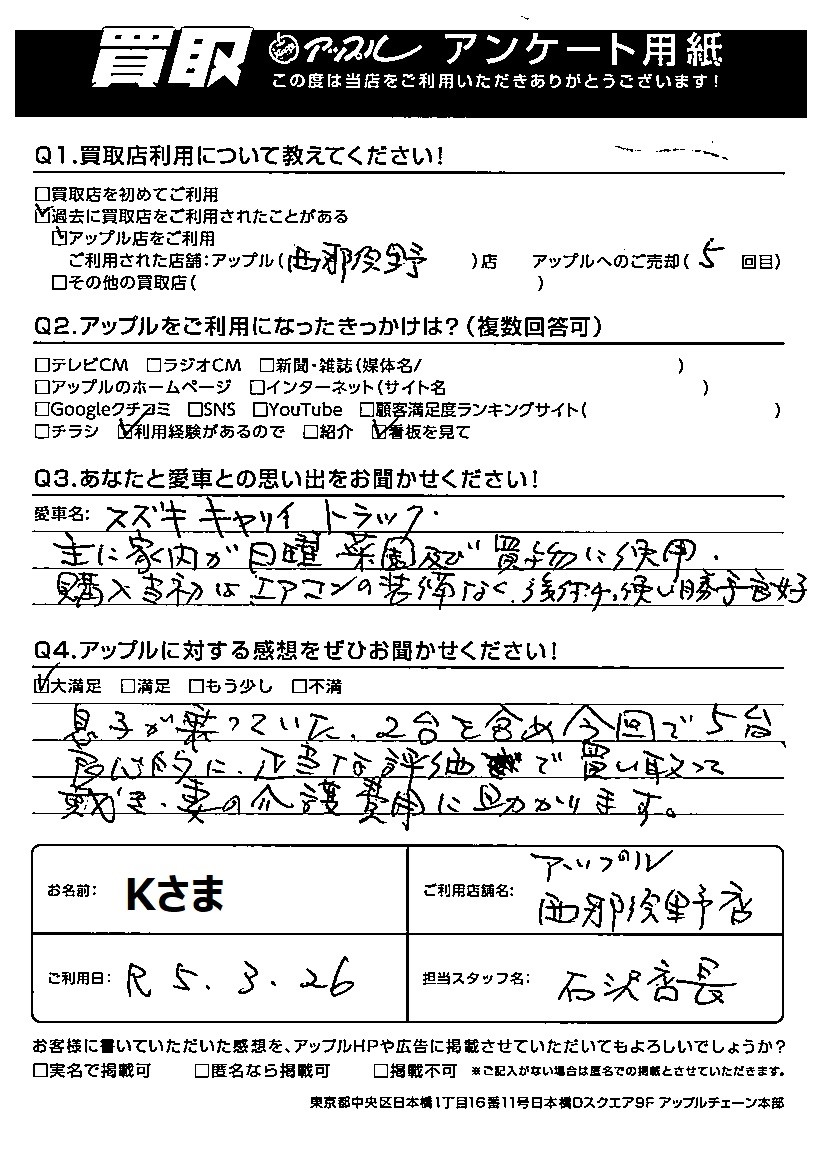 息子が乗っていた、2台を含め今回で5台。良心的に、正当な評価で買い取って戴き、妻の介護費用に助かります。