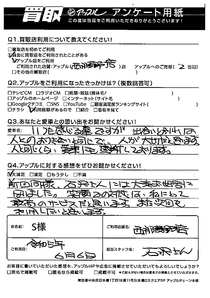 前回同様、石沢さんには大変お世話になりました。笑顔での対応は、私にとって最高のサービスだと思います。また次回も利用したいと思います。
