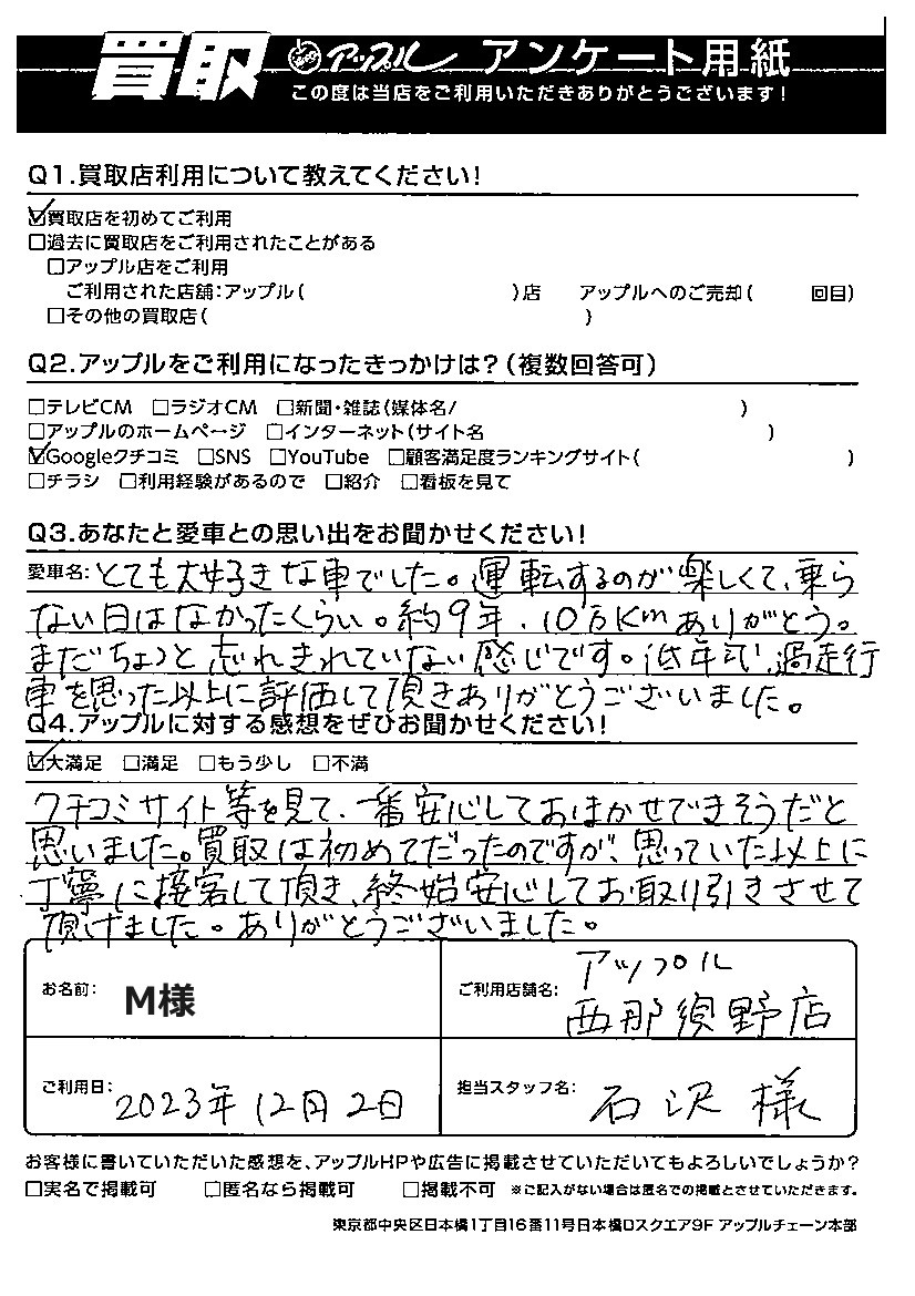 終始安心してお取引きさせて頂けました。ありがとうございました。