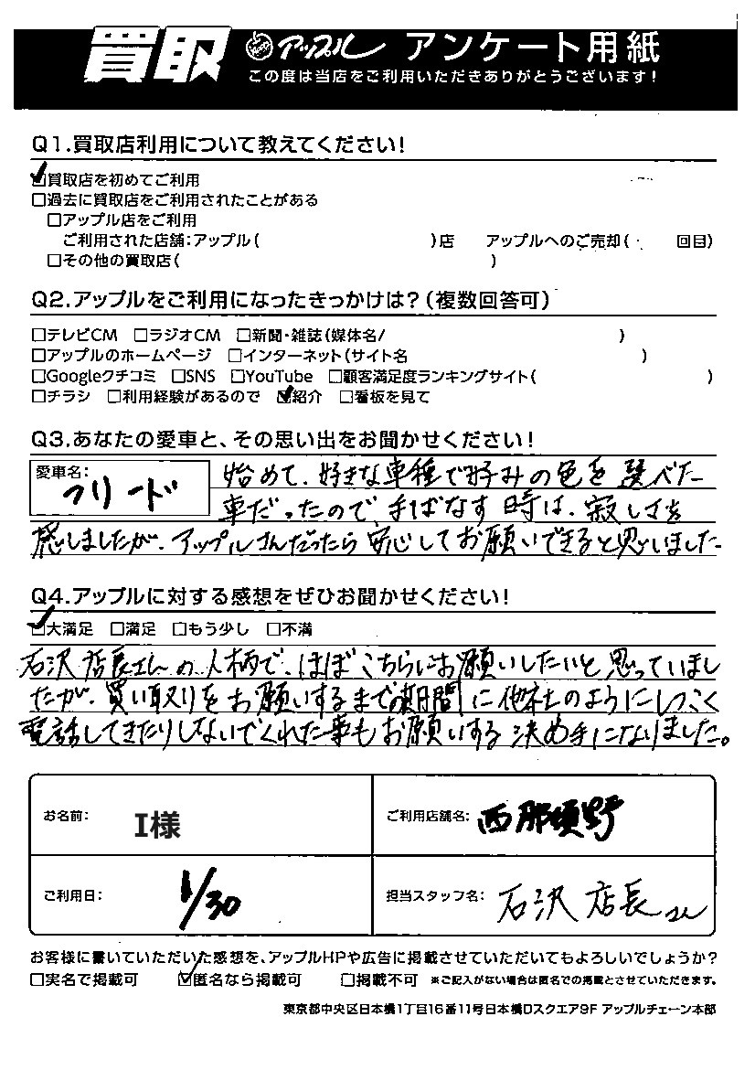 始めて、好きな車種で好みの色を選べた車だったので、手ばなす時は、寂しさを感じましたが、 アップルさんだったら安心してお願いできると思いました。