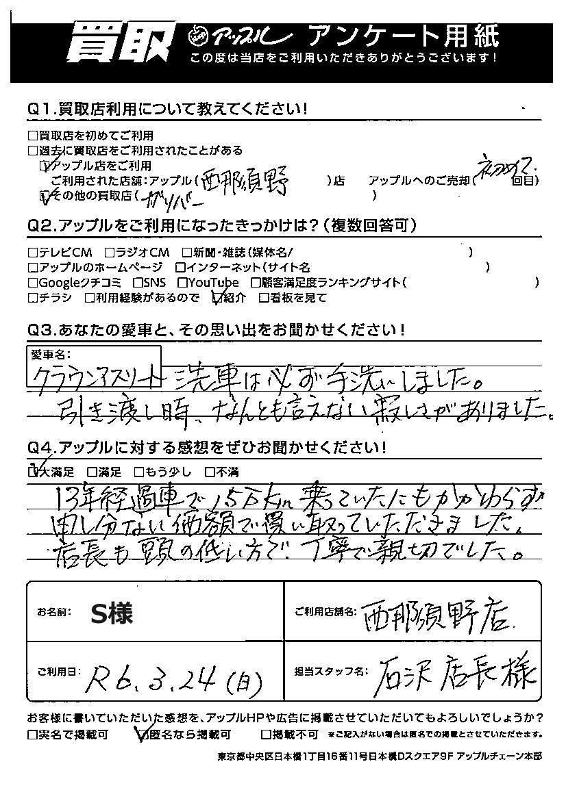 S様 車名:トヨタ クラウンアスリート (H11年9月~H30年6月)