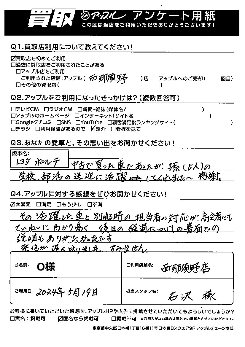 その活躍した車と別れる時の担当者の対応が、高齢者にもていねいにわかり易く、後日の経過に
